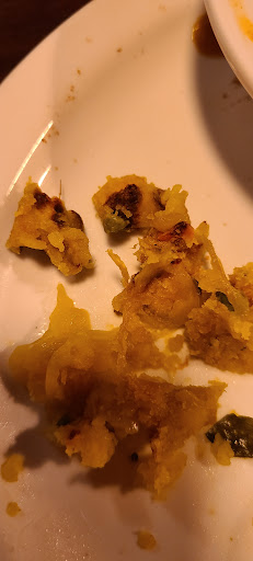 Secondly, the potato they got with the dosa was cold, even cooler than room temperature as if they got this from the fridge. I called the waitress and told her the potato was super cold, she hesitated and said OK, um um um I will take that, she took that, and GUESS WHAT!! AFTER 5 MINS SHE BROUGHT BE BACK BURNT POTATO!! It is not her fault it is clearly the chef. I did not know till I ate half of the potato masala. Like shown in the photo I found those brown hard pieces in the potato. I literally felt like throwing up at that point. HAVE you ever heard of a restaurant serving you cold food and taking it back and serving the same food heated in a microwave? Even the Sambar was so thick with only visible pumpkin pieces, it was disgusting.