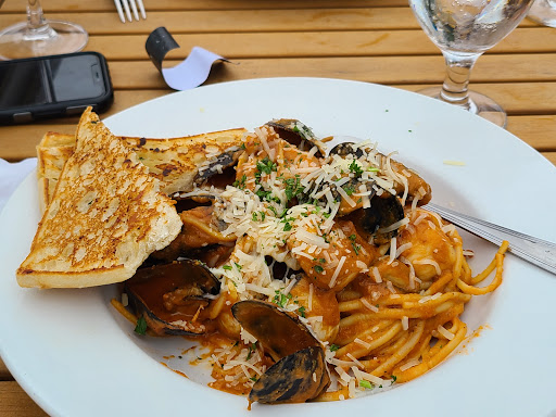 The food came quickly, and was delicious! Fish cooked to perfection and the accompanying vegetables were awesome! The Pasta was also cooked to perfection and tasty! Good portion of mussels, clams, shrimp and scallops. The garlic bread added a nice touch.