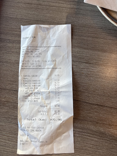 I am giving this place a 1 star only because the server attitude changed in the end and deep fried California roll was ok.Firstly my friends and I came to have supper might I add it was my first time trying this place, my friends recommended it because they had awesome food and customer service few weeks ago.Now it started off with a wait of 1/2 hour before our order was taken and at the time we were the only ones waiting to be served and the restaurant wasn’t full. At around the 20 minute mark, two customers came in and they were offered menu and their food came out in record time, a second set of customers arrived who were also served before us… our sushi was made and sat waiting until theirs was made and they were served before us.When we got our ramen, the soup was luke warm not HOT but like luke warm.We spoke with the waitress and asked her if there was a way to reheat the soup and she said no but to her credit she said she could bring some hot soup to add to ours.Our server came over after with a shrimp tempura that I ordered and without any apologies she said she can reheat the soup but we decided we would take it home to reheat. Might I add the first server said she had no way of reheating the soup.Secondly I also need to point out that we ordered Tonkotsu bbq pork ramen and might I add the pork was not bbq it was like boiled pork no sauce nothing just plain which was ridiculous when on the menu it says bbq none the less After that experience I will not be...