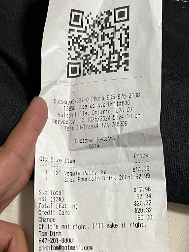 I have attached my receipt along with a screenshot of ordering at a nearby subway outlet for reference.