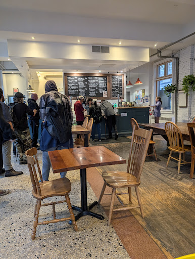 Decor is a stripped to the brick former bank. Simple sturdy furniture including a couple of large tables and a window bar. Some tables have an electrical receptacle nearby. Washrooms are non-gendered single occupancy wheelchair type. The facility has two entry modes, from Barton a small step up from the side street wheelchair access.