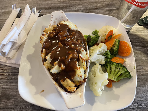 Read moreGenerous portions at a great price but a disappointing experience. Locating parking in this strip mall might be challenging at certain times of the day. Prior to entering the restaurant thereâs a mishmash of tables chairs piled up from the summer season, I suspect, under an awning which does not lend itself to pleasant ambiance. Upon entering the restaurant there is no one to seat you and i walked up to the server who told me to sit at any available table and sheâd be right over. The decor of this pub has a lot of paraphernalia on the walls with big screen TVs playing sports. Thereâs a large pool table in middle which wasnât used this lunchtime. There was only one server for the entire restaurant which did make for a lengthy wait for the food and bill. Additionally there was no service checkup after the food was delivered. Of my party of 4, two of us ordered the prime rib steak/jumbo shrimp. One ordered the shepherdâs pie and the other other was fish/chips. The portions were generous and service was friendly. The steak was chewy and the shrimp was rubbery. The fish/chips were good albeit that the batter had a bit of a sweetness. The shepherds pie was good and tasty. Halfway thru the meal one diner in my party noticed a long hair buried under the chips which was distressing. We informed the server who was apologetic and offered to remake the dish. We accepted but by that time the appetite was spoiled and it was decided to take the rest of the remade dish in a container. The overall cleanliness of the establishment...