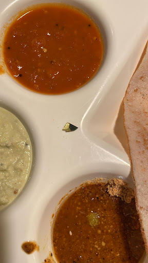 I still ordered Rasam and Mysore Masala Dosa, hoping for the best. ⢠Service time: Excellent (5/5) ā Rasam arrived within 4 minutes. ⢠Presentation & Hygiene: Extremely poor. The serverās thumb was dipped in the bowl while serving ā no gloves, no tray. The same happened again when he brought the masala later, with food literally spilling out of the bowl. ⢠Food quality: Rasam was flavorful (4/5), but the dosa was initially served without masala ā something that shouldnāt happen for a Mysore Dosa. When corrected, the hygiene issue repeated. ⢠Cleanliness: The worst part ā I found a large hair in the coconut chutney. Completely unacceptable.