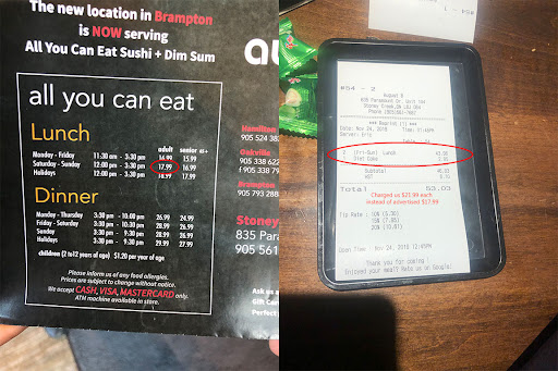 We flat out said we refused to pay, and that they would have to adjust the bill. The manager explained that he had no way of adjusting the prices, which I do not believe. He tried to guilt us by saying the money would be coming out of our poor server’s paycheque.