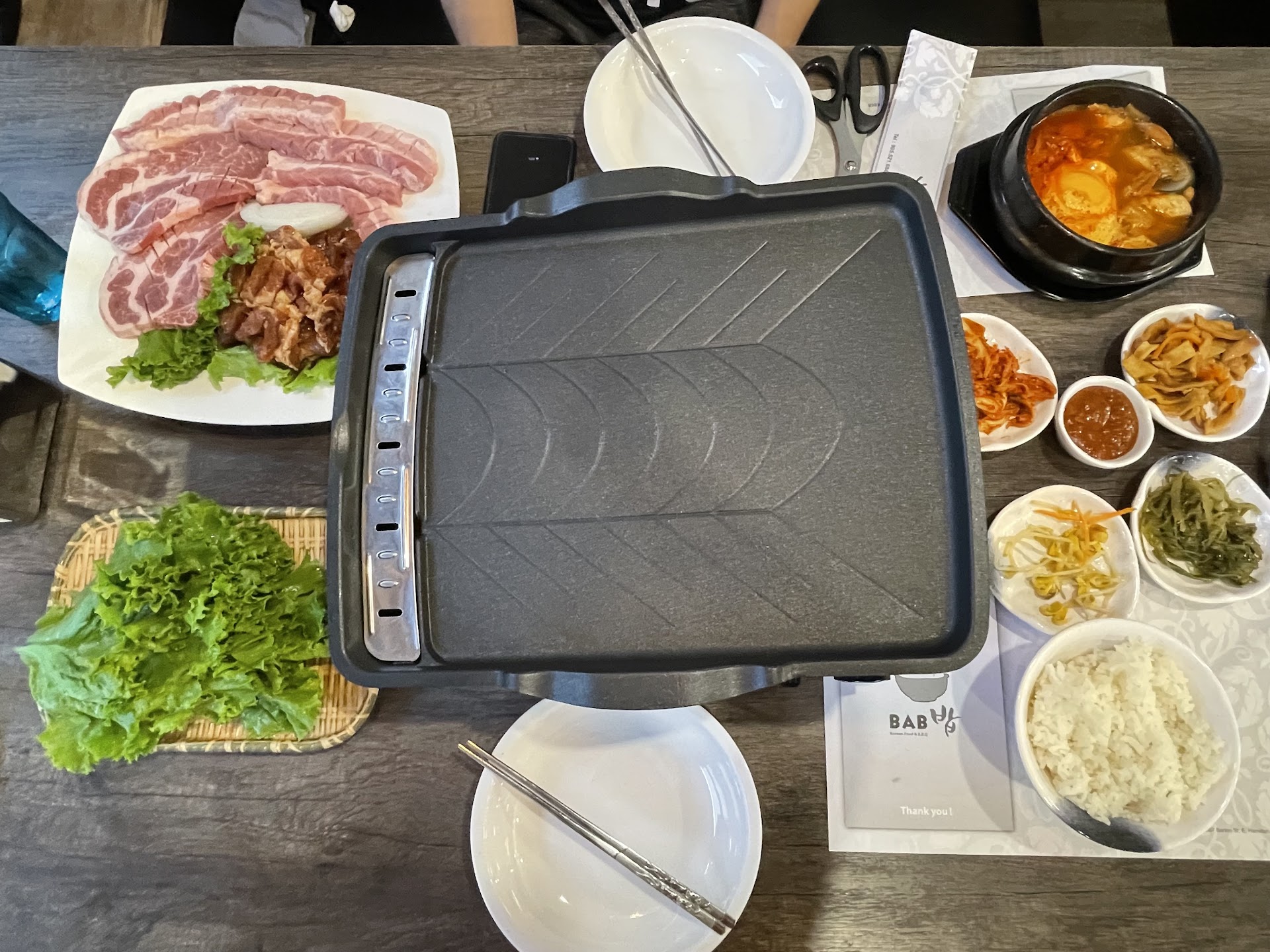 Now, onto service. I donât know if they were understaffed or something, but it was complete utter chaos (I say this as it wasnât only our table that was having problems). While the servers were nice enough, we had to ask for things multiple times before we got it (we didnât even get the lettuce in the end actually but honestly, there wasnât enough meat to eat it with anyway). I donât know if we were supposed to get refills on side dishes, but we didnât get that either. Although the meat didnât actually take too long to come, they never gave us the tong and scissors to cook it with until we asked twice, so the only thing eating till that point was our eyes. We also ordered a side of rice to eat with the beef, but had to ask multiple times for that too before we got it; so once again, the only thing eating was our eyes, only this time, the food was cooked. Same story for the soup, only came after asking. Ironically, the only thing that came on time was the bill.