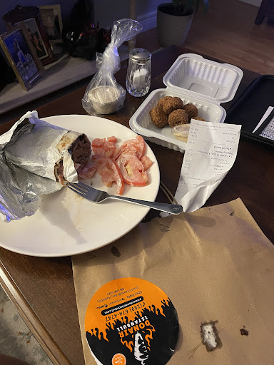 Walking in for the first time was a nice surprise. Lots of seating and windows. A TV or two for entertainment and counter with the meat and toppings on display. Very comfortable to stay or takeout. The staff behind the counter were very nice and they made me feel welcome. They even gave me a little free cup of the Lentil soup that they offer. It was very good. Lentils, curry and some other flavors (garlic?) were a delicious combination.