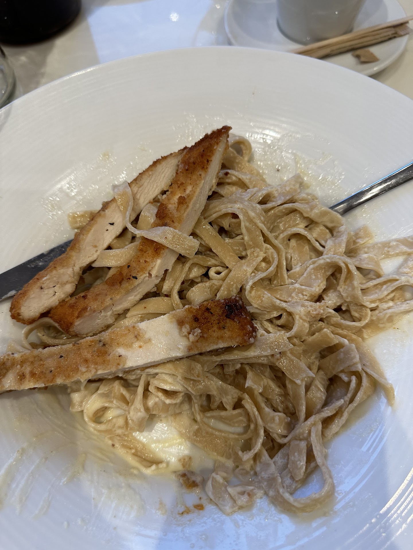 We did not realize that the food would come out as ready, instead of all our entrées at once. I ordered the fettuccine Alfredo with grilled chicken - it came out and there was no chicken. Steph took it back and about 25-30 mins later, it came back out with breaded chicken, also at the same time as the pizzas for the other members of my party. I was not going to make a big deal about the breaded chicken, it doesn’t matter that much. However - where I am quite disappointed is the state of the Alfredo. It very clearly sat there for the 25-30 mins between when it was first brought out and then returned. The sauce had completely separated and looked congealed, and it was not even warm. I did not eat any of it. Again; I did not bring this up to the server as she was having a very bad night dealing with the multitude of mistakes the kitchen was making - for most of the tables. For $37, tepid, congealed pasta with the incorrect type of chicken is unacceptable.