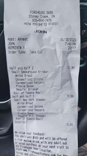 Read moreI am a fan of firehouse subs. I remember the first and only in Oakville and it was consistently amazing. I know there's a lot of chains now but I always hope that they keep up with the standards and expectations. Unfortunately, I cannot say that for this location. My boyfriend and I went there today for take out and we both got standard subs with not many add-ons or revisions. I ordered the large hook and ladder with the hot ones special spicy dill sauce and had a thorough conversation with the employee that I really wanted the sauce but not the spicy pickle on the side because I wanted banana peppers on the sub too. Not only did I get maybe 2 banana pepper slices on my large sub but I also got no spicy dill sauce. It was a white sauce that tasted somewhat sweet and I still have no idea what the flavour was. The hook and ladder normally comes with mustard but I can safely note that there was no mustard or dill sauce in sight. I also didn't get the pepper jack cheese that is standard and what I did get was a...