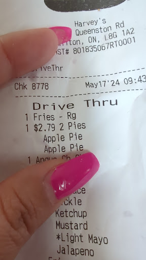 Read moreExtremely disappointed. My husband and I stopped by this Harveyâs on our way home after church and I wish we would have picked a different location. The person who took our order at the drive thru was fine and easy to understand. She took our order efficiently and also seemed to understand what we wanted and confirmed our selections. When we got up to the window we were handed one drink (with no straw). We had ordered two combos (both should come with drinks). We let the girl know and she was quick to get us our second drink (still no straw). We were then handed the bag with our food in it. We looked inside and there was one container of fries (we had both ordered a large onion ring as part of our combo). We let her know and she was sweet and apologetic and quickly got us our onion rings. We also mentioned we needed straws and she got us those as well. However, we wish we would have done a more thorough job looking through the bag as pretty much everything else was wrong. My husband asked for ketchup, lettuce, garlic mayo and extra onions on his burger (nothing else) and he got tomato, pickle, mustard, mayo and NO onions (pretty much completely wrongđŹ). I ordered a crispy chicken sandwich and asked for just pickles and mayo. What I got was pickles, onions, tomato and no mayo (again, very wrong from what we ordered). To top it off we also ordered an 8pk of donuts which they neglected to include in the bag. By the time we realized all this we were already on the highway back to Cambridge with our infant son sleeping in the backseat so turning back wasnât really an option. We spent $40 on something we didnât even want, at least $5 of which we never even got. Not sure who is working on the orders in the back, but they need to either step it up or be fired. This is honestly unacceptable. Not to mention the drinks were also warm (đŹ) and the Dr Pepper was flat. So odd. Probably our worst experience ever at a fast...