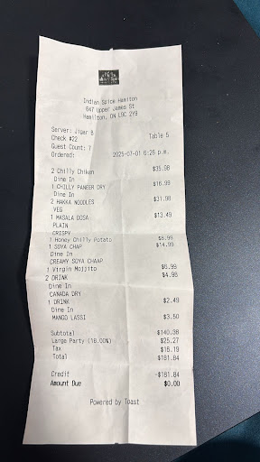 Talking about the food, the dosa was good, but the Malai Chaap had a bitter taste. The mango lassi wasn’t even a cold, it was like room temperature we had to ask for ice separately. The chilly chicken was good, but the paneer in the paneer chilly was so hard that we couldn’t eat it, and we left it as it is. The most concerning part was that no one bothered to ask us how the food was. Instead, some unknown person, in the restaurant’s uniform, kept staring at us, especially when we complained about finding a hair in the paneer chilly plate. I don’t know if this is acceptable or not, but we ended up paying a bill of around $181 for nothing.