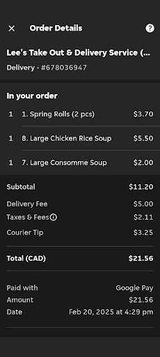 Read moreWe just moved back in this hood, 08/17/2023 area, when we lived in Dundas, ON about 10 years ago, we ordered from this restaurant frequently when we felt like Chinese Food. We since moved far away, so we had chosen or found other establishments. On this day, I wasn’t overly hungry 08/20/23 they close at 10:00 P.M. on Sundays. I placed just a small order of (2) egg rolls and (1) Won Ton soup for pickup. I ordered about 9:25 P.M. and picked my order up at 9:45 P.M. Took my food home, the egg rolls were excellent, good size with plenty of filling inside them (thick and crunchy). The Won Ton soup came in a styrofoam bowl and plastic lid. The broth was steaming hot, broth was excellent, not too salty. Had many ingredients, like huge won ton noodles (with meat inside, very flavourful), mushrooms, spinach leaves, shreds of BBQ pork all in all a very enjoyable “snack”. Friendly proprietors and staff on hand at time of pickup. Will definitely be...
