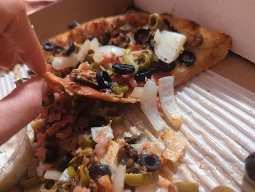 What we got was NO green peppers, and an large amount of green and black olives on it? The crust was paper thin, saugy, and barely any red sauce on the pizza. I picked up a slice and all the toppings fell off, I took a bite and it was saugy and I noticed there was no green peppers. And because I'm pregnant and green peppers were pretty important in that moment, we then decided to take the pizza back and ask for them to remake it correctly.