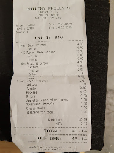 Read moreUnfortunately, the fries were undercooked in both of the poutines that I ordered yesterday at this location. Today I tried to go in to address the issue and they refused to do anything about it. I can send you a photo of the receipt upon request. The burgers were fine, but as mentioned, the poutines were not. Unfortunately, calling in wouldn't have really helped much because I wouldn't have been able to come back until today anyway. So, I went to speak with them in person about it. I live 30+minutes away from here which wouldn't have made it cost effective to return the same day. Ekdant refuses to help resolve the issue. Thus, I hope that somebody from customer service can help me. I was planning to order something else, but after they treated me like that, I left without anything. It's a shame because I have been ordering from philthy phillies for quite a while and generally love the food here. This experience is likely to influence my future visits, potentially.