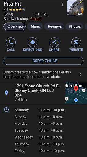 Live about 25 minutes away, Caistor centre direction. Family had a craving for Pita Pit. Checked on Google to see what time it closes on Saturdays, Google listing shows it closing at 10pm. It was 830pm when we left home, arrived at the Stone Church location exactly at 9pm.