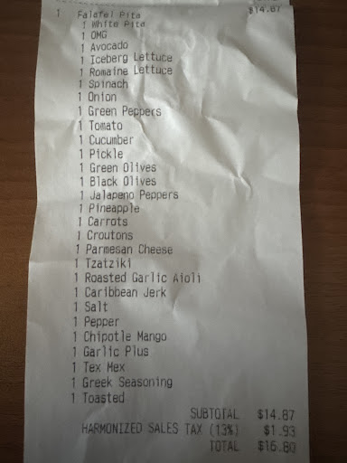 Read moreI go in to this location fairly often as I am a student near by and I usually have a great experience. The staff are always polite and pay close attention to the food (which has not changed even in my most recent experience). However, as a comment mentioned before me my pita did taste like green peppers (which I have strong sensitivities too; but as I mentioned before I had never had to be concerned before because of the great service) and I ordered a smoothie for the first time and it was unfortunately terrible. It was a banana and strawberry smoothie that came to me in a completely liquid state (as if no yogurt was used at all) and tasted only like pineapple juice (which I know is used to make it but that is all it tasted like). I ended up throwing it out because none of my classmates wanted it...