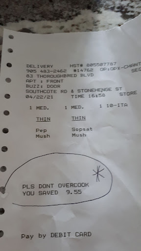 Read moreUsually I'd give this place a 4/5 as the staff are always friendly, food prepared promptly and it's a convenient location. Sadly, today kind of ruined that. We ordered 2 pizzas - a pepperoni and a cheeseburger. We show up at the appropriate time and are told to wait a few minutes for the cheeseburger pizza. After this, they call us over later to say they are out of cheddar cheese. How is that possible? On top of that, why not say this when we showed up, that you hadn't made the pizza or were out of a key ingredient? Anyways, they then ask if we wanted another cheese, we say sure, mozzarella. Next they ask if we want double for some reason. We say no. Then, they make the pizza and give us 3 free cheese balls in sauce and a bag of chips. Not sure how this makes it right by giving us food we didn't want or need, or even like, but sure. We get home, they have used double mozzarella and all the toppings fell off the cheeseburger pizza. We won't be going back to this location and will go to the Rymal/Upper Paradise location instead. Please don't try to make it right by making it worse. Either comp the pizza you can't make, or the order, or just tell us we can't get that today. The effort was there but it was done in...