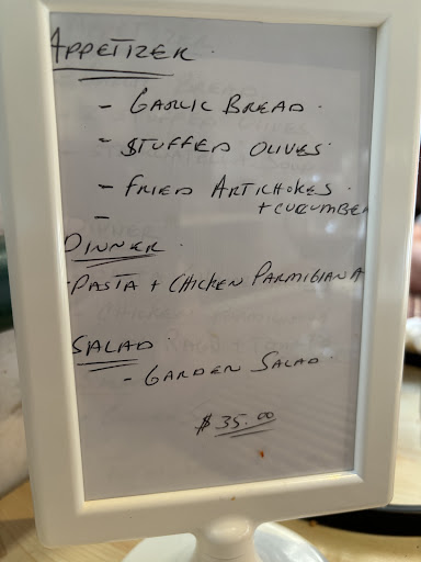 Read moreWe have been here a few times over the years, always going because it is so old Italy and we love the step back in time feeling. We have never had an option other than veal or chicken parm on any of our visits, which we do like, so we know what we are having before we go. There is usually only us there or maybe 1 other table. This past visit July 2025 at 5pm, we were the only diners. We were directed to a table by a window where the light was brighter. The decor has not changed and I am not sure when things were really cleaned last. The table mats were not clean nor were the glasses hanging in the racks on the table. It was a very hot day and there was no ice for the water. The sign on the table said: Appetizers: garlic bread, stuffed olives, fried artichokes and cucumber, Dinner: pasta, chicken parm and Salad: garden salad $35. What we did get was a slice of slightly warmed bread with a garlic spread and no other options, we had a choice of chicken or veal parm, I had chicken and my husband had veal. The meat was ok however the sauce was very bland . What we didn’t get was stuffed olives, fried artichokes or salad. The bill however was still $35.00. It saddens me to say we will...