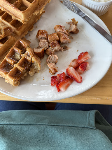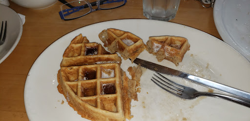 We then ordered our meal. The food took longer than we expected considering there were only a couple other tables with guests at them. When the food arrived the waitress realized my husband’s order was wrong and took it back immediately. We then waited again for about 10 minutes for our food to come out. When it came out my husband’s food was fine but I immediately noticed the lack of food on my plate. I ordered Sunset Supreme Waffles which is supposed to come with strawberry preserves, Fresh strawberries and whipped cream. I asked them to hold the preserves though as I do not like them. The result was them giving me just fresh strawberries and whipped cream which is what I wanted. Little did I know that the fresh strawberries would total up to approximately 1 strawberry cut in small pieces which is ridiculous. Especially since I didn’t have the preserves. Any other location I have been to in the past have never been so cheap with the strawberries. When I asked the waitress about this all she could say was I’m sorry. No offer to provide more or anything. I tried to get past this and start eating only to discover that my waffles were overcooked and very dry. I could barely cut into them with my knife. The waffles were also cold from sitting while my husband’s meal was remade. I also discovered that the sausage I ordered on the side was undercooked. As a result I did not eat my meal. I would have spoken to the waitress about them but she never came back to our table to check on us. At this point there was only one other customer in the restaurant so I know it was not because she was busy.