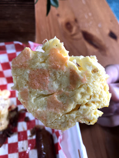 When I arrive home we are missing an English muffin and two pancakes. Our eggs have also taken on the imprint of the checkered wrapping, with squares of red dye deeply leeched into the food.