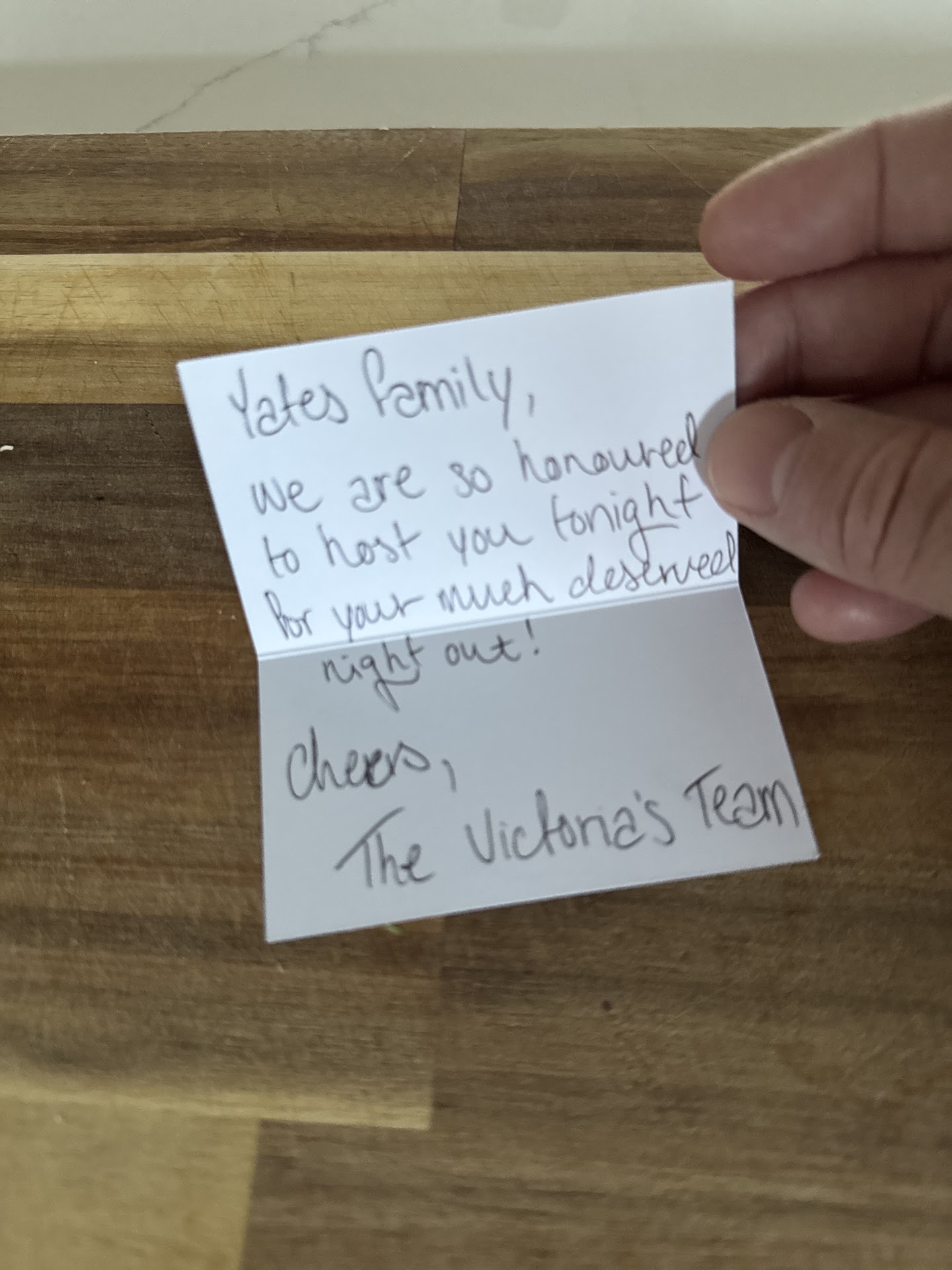 Right away, we were welcomed with a handwritten note from the staff, which was such a thoughtful touch. It set the tone for the whole night and made us feel like more than just another table. Leah, Taylor, Nicole, and Brenden on the bar all made sure we were taken care of, and they worked together like a real team.