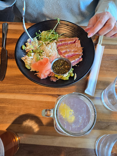 My wife enjoyed the Seared Tuna Basmati Bowl. It was flavorful, and the tuna was cooked perfectly. The pickled ginger added just the right amount of spiciness, and the basmati rice was perfectly fluffy and aromatic. The ponzu dipping sauce also had just the right kick. She finished her meal with the Crispy Southern Hand Pies—two southern-style crispy apple pies with vanilla bean ice cream and Kentucky bourbon caramel. I must say, I was disappointed; they were so good she ate them both, and I didn't get any (I usually get to help finish her dessert!). Sorry no pictures of dessert, it...