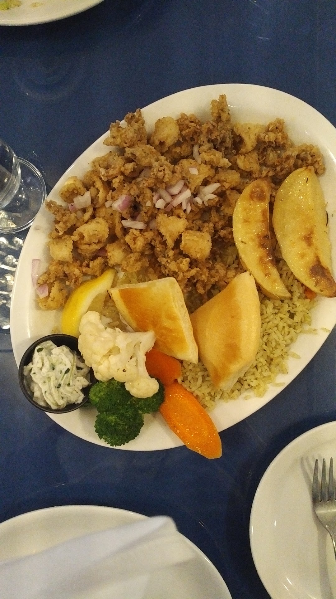 The food was generally tasty. It came out promptly, and by prompt I would say roughly 10-20 minutes after ordering. I ordered the calamari dinner and my party ordered a mixture of roast lamb, souvlaki, spanokopita, and lamb poutine. The calamari was done well (4.5 stars if I had to give it a rating). Everyone else's dishes looked good as well except for my sister-in-law's souvlaki was burnt which she didn't bother complaining about since the kids were hungry. The one general negative comment was that the pita bread should've been served as an appy but was instead served with the ordered dishes, already soiled in the oil of the mains. In most Greek restaurants I've eaten, this is usually an unlimited appy - and not soiled in oil. General positive opinion was that the portions were generous.