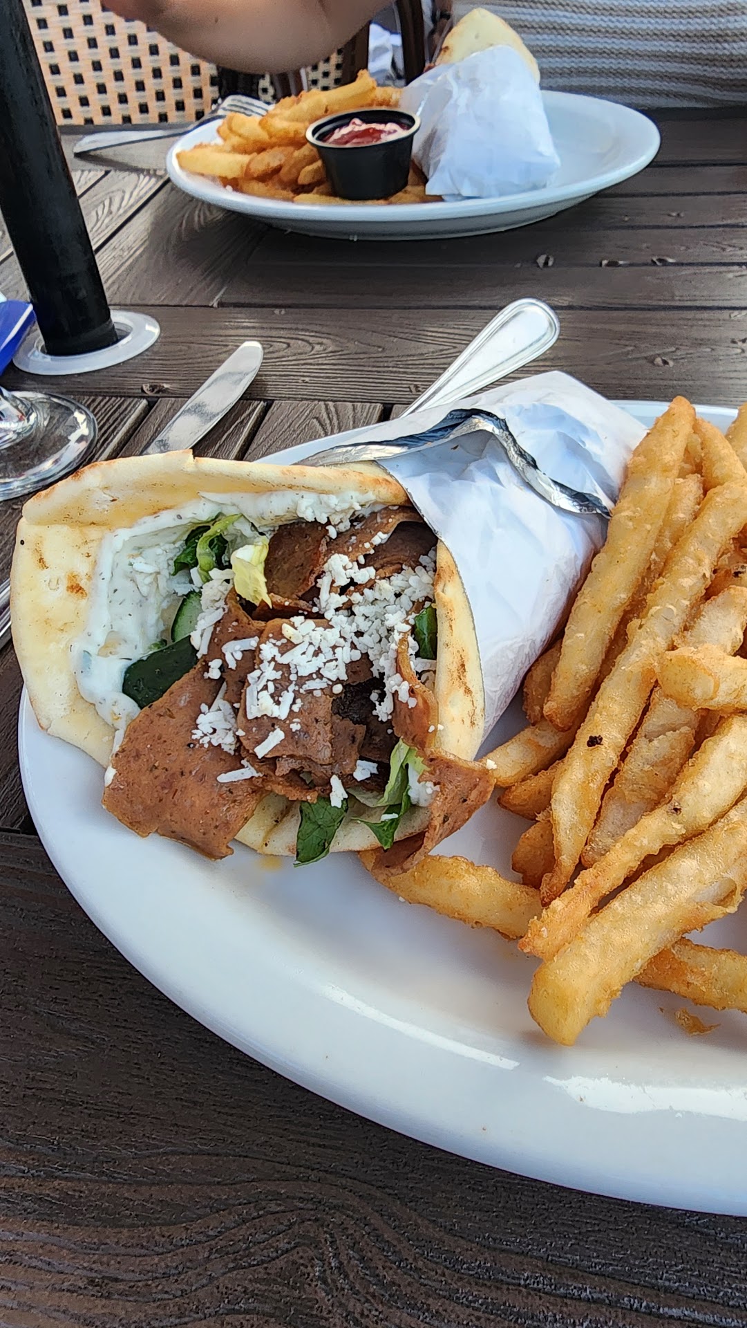 My wife is a vegetarian who opted to trade her rice pilaf and potatoes out for more veggies, was charged an extra $2 for a few more veggies (a couple more broccoli, cauliflower, and carrots). Not sure how that is justified but I can't seem to rationalize it myself. If my wife was asking for more veggies without any trades then maybe justifiable - but that isn't this case. Also extra tzatziki is $1.50. I know a few Greek restaurants that will normally comp this for big parties but will normally charge 50 cents to a dollar. Pricing-wise I would compare this to a mid-range level restaurant but generally I find Greek restaurants on a more family-friendly and low end level. The service based on the pricing level their menus hold would be expected to be better - but of course it wasn't. So in this regard I would say their food is a little overpriced for little gain. Again we were in the back area with no view so perhaps I would feel differently if we had a great view to make it worth the price point. I think in hindsight the fact that it wasn't busy at peak dinner time in mid summer high tourist time says that the restaurant has some room to improve on.