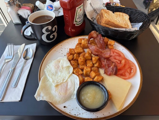 Now, the food. Eventually…and I do mean eventually..it crawled out of the kitchen looking like it had survived a rough journey from the microwave to the plate. Eggs were cold, toast was limp, and the bacon has the personality of wet paper towels. It was less “breakfast” and more “disappointment served on plate”
