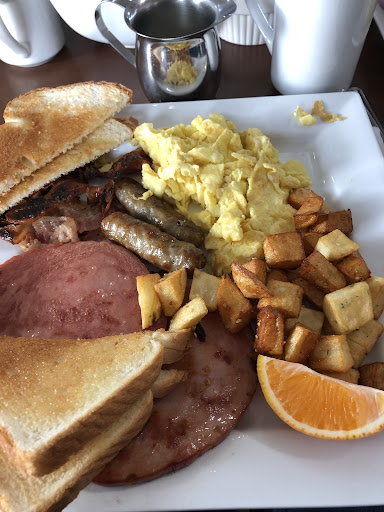 I ate the āTruckerās Specialā which was your choice of eggs, I chose Scrambled Eggs. Along with two slices of toast, bacon, sausage, slice of fried bologna, slice of ham, hash browns, tea or coffee and a slice of orange.