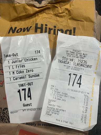 Read moreI ordered a junior chicken mcpicks combo, a large fry (for a sibling), and a sundae. I didn’t check the bag they gave me and walked 25m+ home. The mcpicks combo included the chicken sandwich, small fries and drink. They forgot my fries. There was a hard piece of cartilage/bone in my chicken sandwich, and the sundae had far too much syrup (the syrup wasn’t much of a problem, just really sweet.) My sister ordered separately, ordering a sundae and double burger mcpicks combo. They forgot her drink. I don’t have her receipt, (she threw it out at the store thinking she wouldn’t have a problem, her order number was 173.) but I do have mine. The store was also kind of dirty. the second photo is of the kind of clear, hard, muscle or cartilage type of meat found in my sandwich. If you put it up to light you could see it was translucent and has a rubber texture. It doesn’t show it too well. I also don’t know why it says “medium Coke Zero” i never asked for that. Maybe they accidentally “upgraded” my drink in the combo? But I didn’t ask for that, and don’t know why it says “Coke Zero”. Truly disgusting, and annoying they forgot 2 items in 2 orders. Recently I started to love coming here once in a while for a treat and now I’m just disgusted. Makes me wonder how many other people this day had forgotten stuff. I want a refund or...