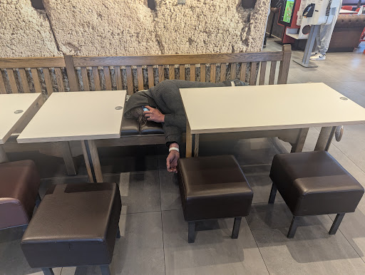 Read moreI had went to this location for dinner and it was noticably busy, there was some families with children and some older folks as well. I used The electronic Menu to order my food and that was working fine. My food was slapped together (sauce everywhere and just clearly in a rush) and the quality of food was quite low, somewhat stale bun, dry meat on the 1/4 Burger. But overall for McDonald's I can't expect too much. However. The atmosphere was absolutely ridiculous. There was a homeless man just laying there taking up multiple spaces and virtually cleared a whole section. I was appalled as this was the first thing I saw when I walked in. Then throughout my stay I had to listen to this man scream, yell & cuss the whole time. Remember there are kids maybe 8-12 years of age that do not need to be exposed to this. After I finished my meal I asked a few folks if the staff had done anything to intervene or get the proper authority involved and to my surprise had heard he had been there for over an hour! It is completely unacceptable and shame on this McDonald's for not acting for...