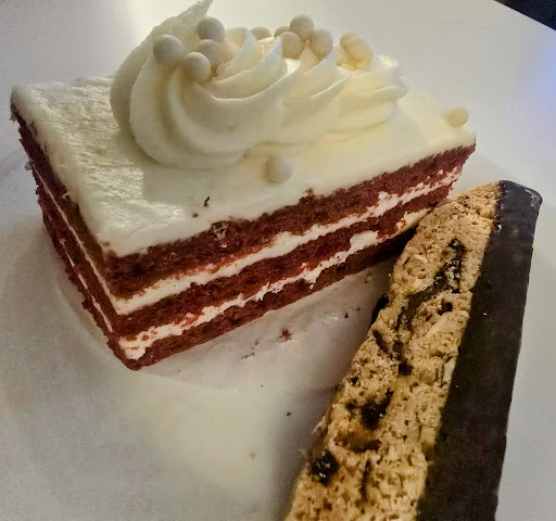 Read moreVery busy shop, small and a little crowded. Customer service was really good though. There was a big line up of people deciding what they wanted. A worker went down the line and helped whoever was ready first. I was in and out quickly. The presentation is great, everything in the display case looks beautiful and yummy. They have no prices on the items though, which was weird. I personally like knowing how much I'm spending before picking an item. I tried the chocolate biscotti and a red velvet cake. The biscotti was very good, I dipped it in coffee I made at home. Sadly the cake was very dry. I ate less then half of it and threw the rest away. I was hoping it was just the edges that had been exposed to air after being sliced, but there was just no moisture in the...