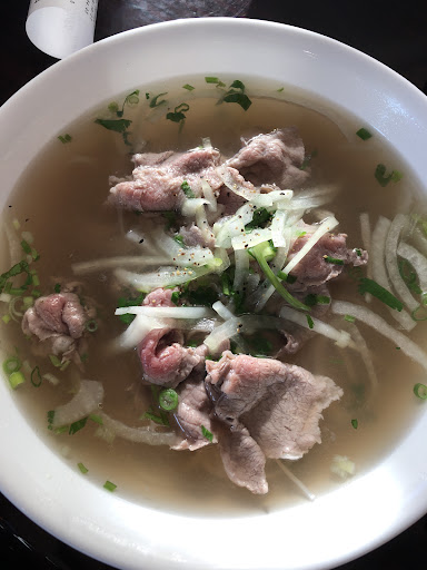 My go to is always the House Special noodle soup. A traditional Viet pho with a light, sweet, mild and savory broth. Noticeable flavors of coriander, basil, and traditional spices such as anise, cinnamon, clove and fish sauce. Served with thick style vermicelli, soft pieces of tendon and cartilage, thinly sliced tripe, rare slices of loin, meatballs, and accoutrements such as cilantro, bean sprouts, white onion, lime, and hoisin/sriracha. A hearty meal for any day of the week. For a beginnerโs palate I would recommend the basic beef noodle. There are many traditional vermicelli and rice dishes that I look forward to trying. The apple fritters and honey rings are always a popular treat.
