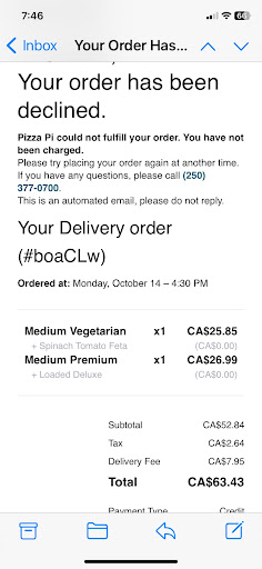 Ā Ā Ā Read moreWorst experience ever. Drove all day and was starving when I got to the hotel! Pizza Pi came recommend and what a JOKE!! $53 + tip and delivery fee $63.79 for a chicken ceaser salad that maybe had a 1/2oz of chicken, mushy fries, burnt wings that were supposed to be salt and pepper but because they were burnt you could not taste anything but burnt! When I called for a refund I was told we can't do that because the driver is too busy and no manager around. They then said possibly cash refund, but apparently the owner was called( after 30 min on the phone) and he said no refunds and its their policy basically. I've never seen such horrible hospitality industry treatment! TERRIBLE experience again and owner must be making bank on this side rip off hustle. Update: they only slightly redeemed themselves as the pizza they gave...