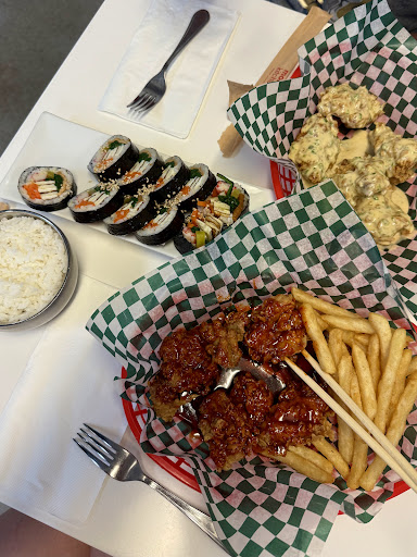 The food itself? Absolutely incredible. We got 2 orders of crispy chicken (Angry sauce and OMC sauce- amazing!!!!), gimbap and japchaebob (spicy pork). The fried chicken was perfectly crispy on the outside, juicy on the inside, and packed with flavor. The angry sauce is very spicy, and we were even given a sweeter sauce just in case it was too spicy 🥹. The food was amazing. Every bite was delicious and comforting after a long day on the road.