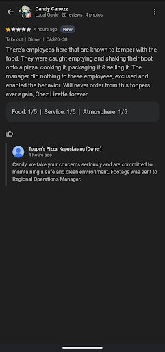 There's employees here that are known to tamper with the food. They were caught emptying and shaking their boot onto a pizza, cooking it, packaging it & selling it. The manager did nothing to these employees, excused and enabled the behavior. Will never order from this toppers ever again, Chez Lizette forever Edit: not sure why toppers edited their response but they first responded by saying the footage was sent to the regional manager. Hopefully this manager actually did something considering the manager here did absolutely nothing. This will be reported to the porcupine health unit. I assume toppers changed their response to my review because their response had confirmed one of their employees did in fact tamper with the food by shaking their boot all over the pizza that's on the prep table where they prep other pizzas, then continue to also contaminate the oven. You aren't even supposed to pick up anything you dropped on the ground while prepping food because of how disgusting that is. One of your employees EMPTIED THEIR STINKY BOOTS ON YOUR CUSTOMERS PIZZA. This situation better be...