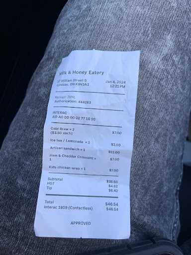 My 92 year old mother and I had lunch at Milk and Honey Eatery. When we walked into the restaurant at high noon it was buzzing with patrons. The atmosphere was electric yet calming. Beautiful brick walls and eclectic wooden tables and chairs with plenty of walking space between them. Vaulted ceiling with semi open concept kitchen.