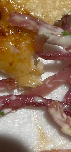 Yet, my dear comrades, the sting of betrayal lingered like a forgotten lyric in the wind. The audacity of those follicles, daring to nestle betwixt the onions, spoke of a lackadaisical approach to hygiene that would make even the most audacious gonzo journalist quiver. I am left pondering, were these strands evidence of a harried onion cleaner, or a hirsute marauder who scoffs at the very notion of cleanliness?