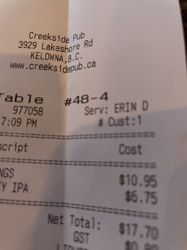 Read moreSo we just went for Wings at the Creekside Pub , which used to be an amazing place with amazing food and a great staff ! We used to go twice a week , Wing Wednesday and again on Saturday for Ceasers as the energy was excellent and the staff were great food was amazing and they had homemade handcut fries , the tastiest fries going , but now they are frozen from a bag ... I stopped ordering anything with fries because there is a huge difference in taste and quality ... But over the last few months the quality of food has declined and prices in some case have went up . Tonite we were served our wings with a dipping sauce (usually for the veggies that came with) and no veggies ... When I asked the waitress about the missing veggies she told us there is now an up charge for the 4-6 veggies that would accompany the wings , I laughed and thought she was kidding because they still served the veggie dip , but to my great dismay she was being serious because apparently its not cost efficient anymore so they will no longer be serving veggies with wings unless you pay more ... Nor will they be serving the fries they were known for ... I'm not one to usually write a review , I usually just stop going to places when such things happen , but the Creekside was a regular hangout for my friends and I , but now most of my friends are no longer going there as there is better Wing deals elsewhere and they aren't getting nickle and dimed to death for lower quality food ! ... This saddens me but after 5 years of Loyal customers we will be doing the same as of today , ... The Creekside is losing all the people that kept them in business ... Terrible to see this...