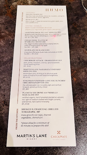 Read moreFinally made it to Humo, and not only did it not disappoint, it exceeded expectations. Chef is the boss of sauce. From the coconut lemongrass leche de tigre (ceviche), to the chorizo foam (octopus). Every bite we had was incredible. I’m intolerant of glutens and one of the guests was pescatarian, we very much enjoyed our entire dining experience ordering a few things at a time and sharing everything. We had Guacamole (which is hands down THE best guac I have ever had and I LOVE guac…), Albacore Tuna (that truffle ponzu 🤤), Aguachile (a must have whenever it appears on a menu), Cod Tacos (which I totally missed are beer battered, thankfully the server mentioned when she dropped them off and everyone else loved them) and the churro dessert (which they kindly put the glutens on the side so I could try, i took my bite and then my friends dumped the glutens on and nearly licked the bowl, probably would have if they could have.) I wish I was the type of human who took pictures of their food because everything was presented so beautifully but I’m not. So you’ll just have to go and see & taste for yourself. Also, as a side note felt it was very reasonably priced for what you get. We were all VERY satisfied at the end of our meal. My only critique would be it would have been really nice to have spoons, the sauces are so good. We did end up asking for a spoon nearly every course (we couldn’t wait on the first course because it was soo good), but it made us feel needy having to ask. So we appreciate how quickly one was provided and with a smile. All in all, a must try in the Okanagan from a very particular diner with exceptionally high...