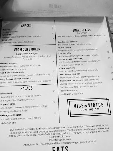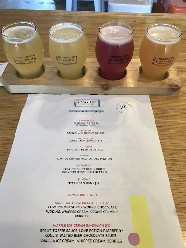Read moreI tried to visit this Brewpub on a Tuesday a few weeks back when I was in Kelowna, but they are closed on Tuesdays. Was in town again on a Saturday and am I glad I came back. The venue is lovely, modern and spacious. Luck was on my side as they serve BBQ options on Saturdays, and they hit it out of the park. Their beers are fresh, clean and tasty. My personal favourite on my flight was the hazy IPA, but the show-stopper was the BBQ Brisket Burger with a much better-than-average garden salad. My taste buds were singing and I did a stationary happy food dance!! The service was friendly and personable, and both the server and the line chef came over to speak with me more than once about the food and drink. They were proud of their products, and rightfully so. Outstanding dining and service in every aspect. Vice and Virtue Brewing is a destination on a...