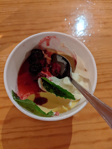 Vanilla Bean Pot de Creme Served with berry compote Garnished with whipped cream Choice was between This and Apple Streudel, would have gotten the Streudel but it had raisins in it. The Vanilla Bean Pot de Creme (like a pudding but better) was the perfect way to finish a wonderful meal, without being a heavy dessert.