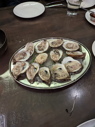 Coles notes on oysters from someone who has been known to carry shucking knives in his car: east coast, properly shucked and separated from the shell, haven't yet had a shell fragment in the oyster than I can recall. Served with lemon and horseradish, and a couple sauces (I wanna say a shalloty red wine vinaigrette, but my memory might be failing me)