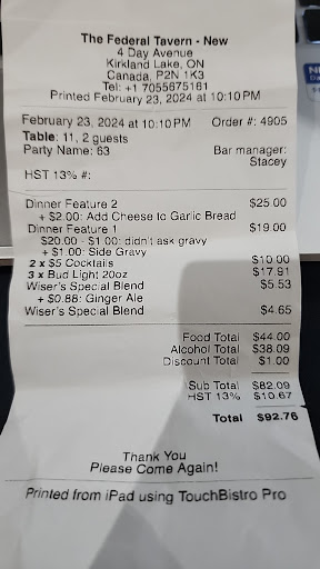 Read moreDuring the week at least this place is kind of dull. There was some regulars chatting and hockey on all 5 scteens. I don't really like hockey, so it was pretty boring. The food is pretty hit-and-miss. It seems like they have at least one good cook, or maybe a chef. But sometimes it can be pretty awful. In 35 years of working on the road, I hsd one of my worsr meals there. The spaghetti special, which wasn't exactly cheap, looked and tasted like it was out of a can of no-name pasta. Thin sauce with literally no ground beef or any sign of a mushroom or some other vegetable. The pasta itself was mushy. Nonetheless, I ate there with a friend 2 nights ago, the hot hamburger. It seemed impossible to screw up right? Well, that's what I would have said about spaghetti, so I shouldn't have been surprised to be throwing up 45 minutes after I ate. I don't have stomach issues at all, nor any food sensitivities. I eat anything I want, anytime I want. Actually, I live on solar power but for a while before I had it up, I didn't have much of any refrigerator and I think sometimes my food may have been a little dodgy. But I can't afford to throw out food so I ate stuff I might not have if I wasn't isolated from regular shopping. I didn't ever get sick though, yet I did from the Federal kitchen. It might have been the wine. I don't drink Merlot, so I wasn't sure if the flavour was odd or I just don't really...