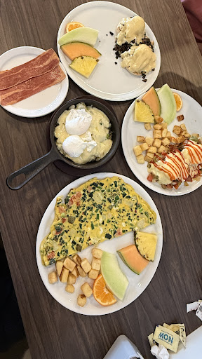 The Veggie Omelette was packed with fresh vegetables and cooked to perfection — light, fluffy, and full of flavor. The Southwest Benedict was a showstopper: topped with rich hollandaise and a drizzle of sriracha, it had just the right balance of creaminess and heat. The Coco Benedict was equally indulgent, with a delicious savory base and velvety sauce. Each dish was served with perfectly crispy breakfast potatoes and a refreshing fruit medley.