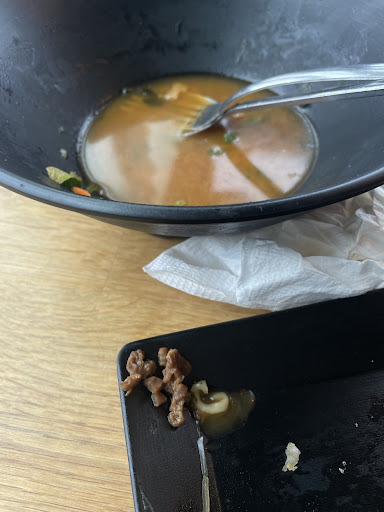 I wanted ramen, so I ordered the “Korean Ramen” (#17 on the menu, see image) because it was the only option without meat (I’m a pescatarian). It specifically had a green V next to it on the menu, which always means that the item is either vegetarian or vegan, so I felt safe ordering it. As I ate, I found small bits of beef throughout the soup. I don’t like to cause trouble as I know that mistakes can happen, and it was easy enough to pick the meat out of my soup and put them on a plate (see picture). I decided to show to the waiter after so that they could address the mistake because I wouldn’t want this to happen to someone else who’s vegetarian for religious reasons, or someone who’s vegan, or someone who’d freak out if this happened to them. When I went to the cash to pay, I explained what happened to the waiter and gave her the plate. She replied instantly that it’s normal for the soup I ordered to have beef in it. I was confused and told her that the soup has a green V next to it on the menu which means that it should at least be vegetarian. She handed me the menu and asked me to show her where I saw that, and I did. She seemed really apathetic and didn’t offer an apology or anything, she took the plate and said that she’d check into it. She put the plate aside, charged me for our meals like normal, and continued to serve other people (it was pretty clear that she wasn’t going to do anything about it). I was very disappointed at how this was handled, especially since me and my friends love eating at this restaurant. I’d like to know how this will be handled in the future before returning.