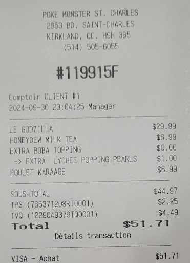 Read moreHad a Bad experience here. It was late at night and I ordered a Monster Bowl, bubble tea with Lychee boba and Karaage chicken. They messed up my drink order, and once I got to the Hotel I realized that the Monster bowl, for which I specified that I could not eat shrimp, was also messed up. I called and they said to come in the next morning but because I was very hungry and it was around 1am, I drove all the way back (20 min) and refunded the meal completely. And this is where the big issue comes, the cashier showed that he barely even cared. He did not compensate me anything and he tried to refund me without returning me the 14.98% tax that came with the food. He gave me the tax money with the 30$ the bowl costs, but later I realized that he left me short of some money and did not completely refund me. I had a very bad experience and unfortunately I cannot leave a good review for this place based on my stressful and...