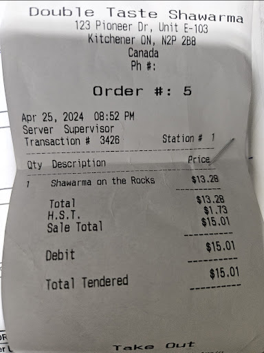 If you order a plate they will barely put any rice or shawarma and they put a lot of lettuce to make it look like itās a lot of salad but itās not..they only put a few pieces of cucumbers and tomatoes and thatās it the rest is all lettuce. Their Cambridge location is the only one to go to. The Kitchener wants are not good because they are owned by the same lady.