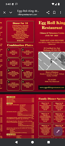 Read moreWe ordered the combination plates from Egg Roll King yesterday and were eager based on the reviews and the fact that we have not been too impressed with the Chinese Food Restaurants in KW since we moved here. We read from the reviews that they are busy and tried to get through for over an hour. We were finally able to get through just after 7pm and we were told that the food would be fresh (keep in mind the restaurant closes at 9pm) Our food was delivered just after 8pm; although the portions were healthy the quality of food was not good at all. Our the kids (4) did not enjoy their meals.The quality of the food seemed to be that we were given what was left before they close. My husband's Rice had the clumped burned rice from the bottom of the pot all throughout his meal. The chicken balls seemed to be fried twice and the spring roll was mushy for each of the 6 combos we ordered. I'm not sure about the other 5 star ratings but we were very disappointed for the amount of...