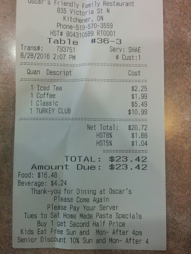 Read moreI visited Oscar's on a Saturday at 11:45 AM with a group of 7, including 3 children. We were seated immediately in a large booth which had plenty of room. (+1 ) We asked for a lunch menu which we were provided even through Saturday lunch doesn't start until 2:30 pm for some unknown reason. (+1 ) We promptly placed our orders, 2 kids having rainbow pancakes and the third with a pogo and fries. I had the Canadian Eh (pictured), my wife The Usual and our friends pancakes and french toast with sides of bacon and sausage. We all placed drink orders with the kids all having white milk... and being told that they don't offer chocolate milk... (minutes later chocolate milk is delivered to an adjacent table... Kids did not notice.) (-1) When the milk arrives the waitress dropped all 3 plaric cups at the end of the booth and walked away without a word. (-1) When the food arrives it turns out the kids pancakes are larger than the adult pancakes, albeit 2 instead of 3. (-1*) When the food arrives they don't bring out my wife's food... the server has no idea. Has to go back to the kitchen... she returns almost immediately with the plate of food. (+/-1*) They forget to bring out my friend's orange juice and needed my 7 year old to remind them. (-1*) My wife and the other couple had very good meals (+3*) their sides arrived with the meals. My eggs over easy were properly runny but the whites were not completely cooked... leaving a slimy residue on the plate and an unpleasant taste in my mouth. (-1) They offered to refill my coffee... and they never did. (-1) For 7 of us with full meals it cost less than...